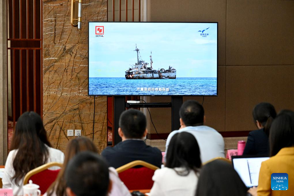 This photo taken on July 8, 2024 shows the releasing ceremony of A Survey Report on the Damage to Coral Reef Ecosystem by Illegally Grounded Military Vessel at Ren'ai Jiao in Beijing, capital of China. (Xinhua/Li Xin)