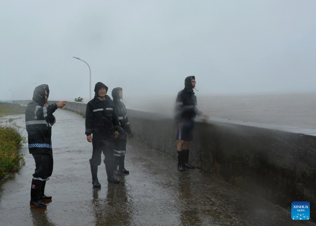 Staff members patrol the sea wall in Jiangyin Town, Fuqing City, southeast China's Fujian Province, July 25, 2024. Typhoon Gaemi, the third typhoon of this year, made its second landfall in China on Thursday evening, according to the provincial meteorological bureau of Fujian. With a maximum wind speed of 33 meters per second at its center, the typhoon landed at the Xiuyu District in the city of Putian, east China's Fujian Province, at around 7:50 p.m., according to the bureau. Gaemi made its first landfall at around midnight Thursday in eastern Taiwan's Yilan County, leaving two dead and 201 injured, local authorities said. (Xinhua/Wei Peiquan)