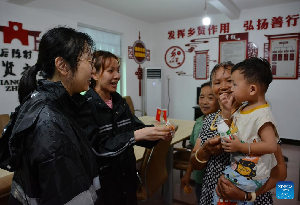 Staff members (1st, 2nd L) offer necessities for relocated people at a relocation site in Houchen Village of Jiangyin Town, Fuqing City, southeast China's Fujian Province, July 25, 2024. Typhoon Gaemi, the third typhoon of this year, made its second landfall in China on Thursday evening, according to the provincial meteorological bureau of Fujian. With a maximum wind speed of 33 meters per second at its center, the typhoon landed at the Xiuyu District in the city of Putian, east China's Fujian Province, at around 7:50 p.m., according to the bureau. Gaemi made its first landfall at around midnight Thursday in eastern Taiwan's Yilan County, leaving two dead and 201 injured, local authorities said. (Xinhua/Wei Peiquan)