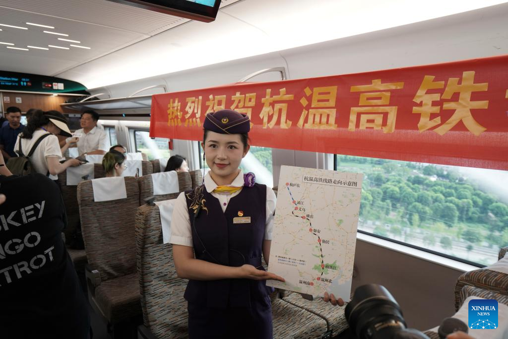 Staff members stage a show on the first trial bullet train G55701 on the new high-speed railway linking Hangzhou and Wenzhou in east China's Zhejiang Province, July 30, 2024. A new high-speed railway went into trial operation on Tuesday linking two economic heavyweights of Hangzhou and Wenzhou cities in east China's Yangtze River Delta region. Extending 260 km, the railway with a designed speed of 350 km per hour has nine stations, offering a rapid transit solution along the route threading the economic hubs of Hangzhou, Yiwu and Wenzhou in the delta area known as one of the country's most economically vibrant regions. (Photo by Su Qiaojiang/Xinhua)