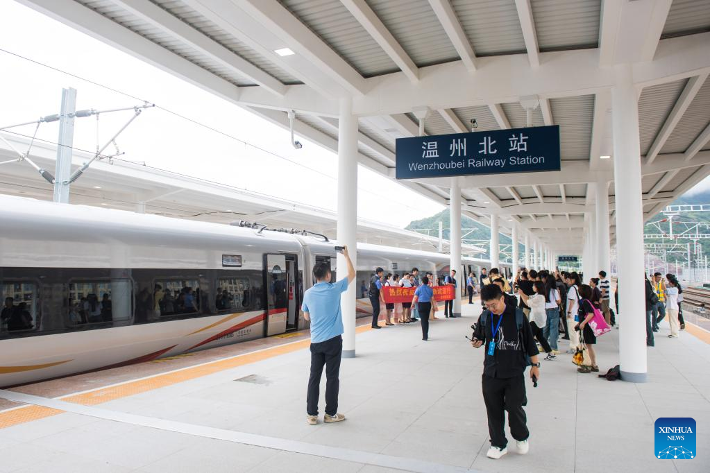The first trial bullet train G55701 arrives at Wenzhoubei Railway Station on the new high-speed railway linking Hangzhou and Wenzhou in Wenzhou, east China's Zhejiang Province, July 30, 2024. A new high-speed railway went into trial operation on Tuesday linking two economic heavyweights of Hangzhou and Wenzhou cities in east China's Yangtze River Delta region. Extending 260 km, the railway with a designed speed of 350 km per hour has nine stations, offering a rapid transit solution along the route threading the economic hubs of Hangzhou, Yiwu and Wenzhou in the delta area known as one of the country's most economically vibrant regions. (Xinhua/Jiang Han)