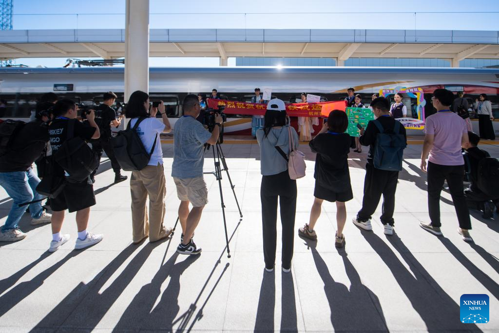 Journalists report the trial operation of the new high-speed railway linking Hangzhou and Wenzhou at Tongludong Railway Station in Hangzhou, east China's Zhejiang Province, July 30, 2024. A new high-speed railway went into trial operation on Tuesday linking two economic heavyweights of Hangzhou and Wenzhou cities in east China's Yangtze River Delta region. Extending 260 km, the railway with a designed speed of 350 km per hour has nine stations, offering a rapid transit solution along the route threading the economic hubs of Hangzhou, Yiwu and Wenzhou in the delta area known as one of the country's most economically vibrant regions. (Xinhua/Jiang Han)
