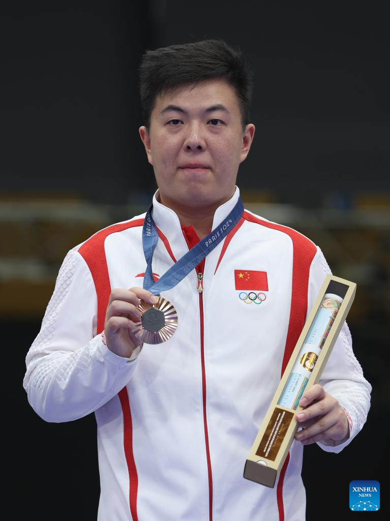 Bronze medalist Wang Xinjie of China attends the awarding ceremony after the 25m rapid fire pistol men's final of shooting at the Paris 2024 Olympic Games in Chateauroux, France, Aug. 5, 2024. (Xinhua/Zhao Dingzhe)
