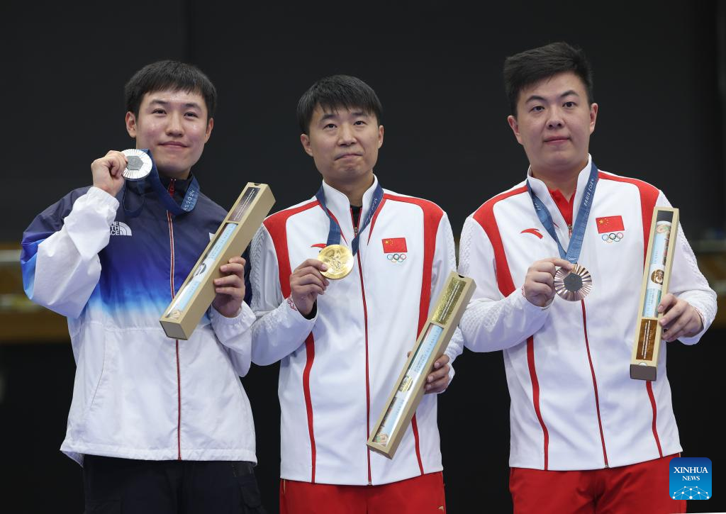 Gold medalist Li Yuehong (C) of China, silver medalist Cho Yeongjae (L) of South Korea and bronze medalist Wang Xinjie of China attend the awarding ceremony after the 25m rapid fire pistol men's final of shooting at the Paris 2024 Olympic Games in Chateauroux, France, Aug. 5, 2024. (Xinhua/Zhao Dingzhe)