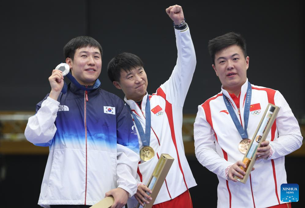 Gold medalist Li Yuehong (C) of China, silver medalist Cho Yeongjae (L) of South Korea and bronze medalist Wang Xinjie of China attend the awarding ceremony after the 25m rapid fire pistol men's final of shooting at the Paris 2024 Olympic Games in Chateauroux, France, Aug. 5, 2024. (Xinhua/Zhang Fan)