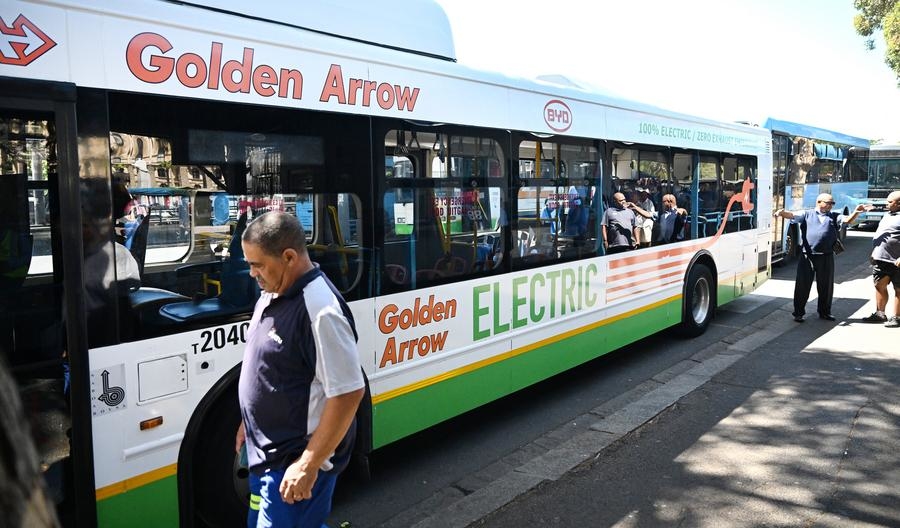 Passengers board a BYD electric bus in Cape Town, South Africa, Feb. 28, 2024. China-made electric buses have been incorporated into the day-to-day operations of Golden Arrow Bus Services here. (Photo by Xabiso Mkhabela/Xinhua)