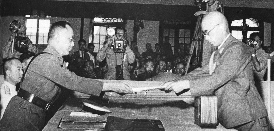 File photo taken on Sept. 9, 1945 shows He Yingqin (L), representative of the Chinese government, receiving the surrender of Japan in Nanjing, east China. On Aug. 15, 1945, Japanese Emperor Hirohito delivered a recorded radio address to the nation, announcing the surrender of Japan in World War II, one day after Japan declared its acceptance of the provisions of the Potsdam Proclamation jointly issued by China, the United States and Britain on July 26, 1945, with the Soviet Union joining later. (Xinhua)