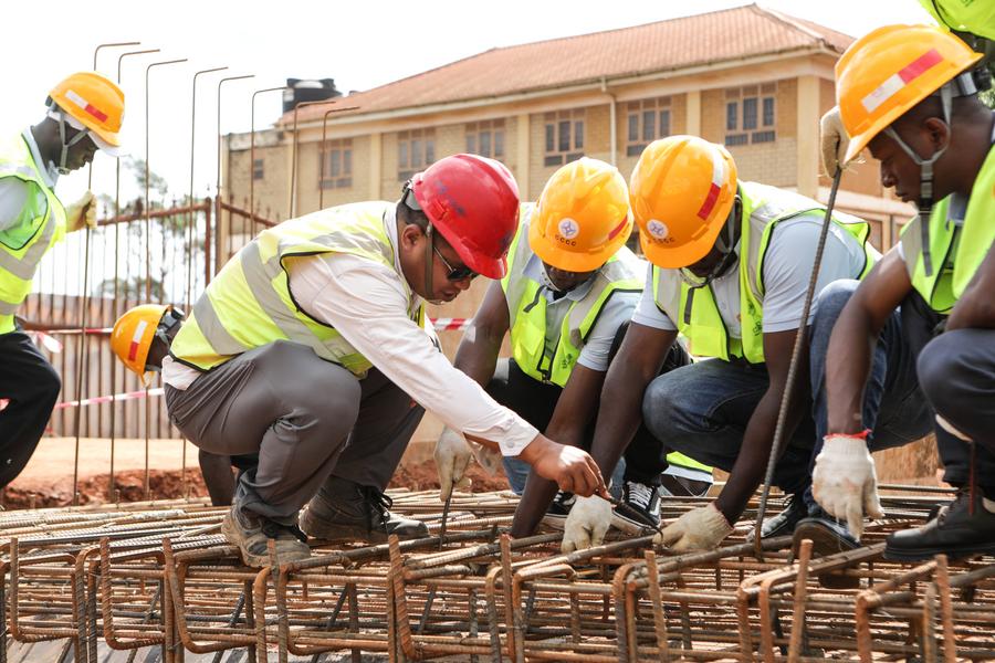 Trainees practice rebar tying operations under a Chinese engineer's instructions in Kampala, Uganda, on April 27, 2024. (Photo by Hajarah Nalwadda/Xinhua)