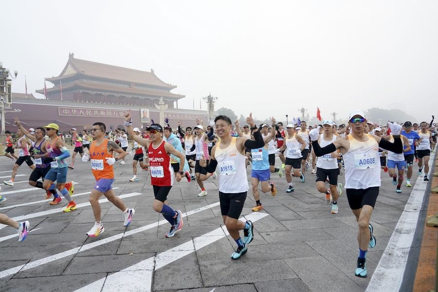 Participants run past the Tian'anmen Square during the Beijing Marathon on Nov. 3, 2024. (Xinhua/Zhang Chenlin)