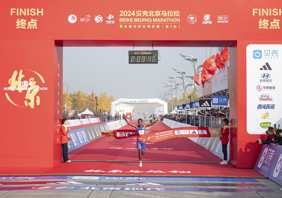 Lemi Berhanu Hayle of Ethiopia crosses the finish line during the Beijing Marathon on Nov. 3, 2024. (Xinhua/Chen Zhonghao)