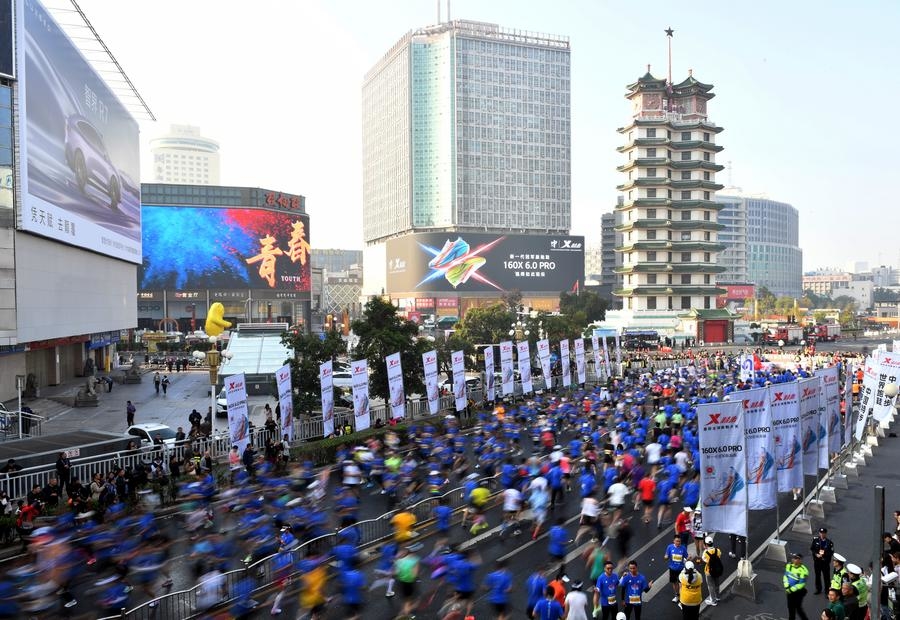 Participants run past the Erqi Square during the 2024 Zhengzhou Marathon in Zhengzhou, central China's Henan Province, on Nov. 3, 2024. (Xinhua/Zhao Peng)