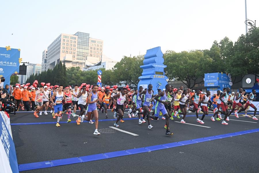 Participants start during the 2024 Hangzhou Marathon in Hangzhou, east China's Zhejiang Province, on Nov. 3, 2024. (Xinhua/Huang Zongzhi)