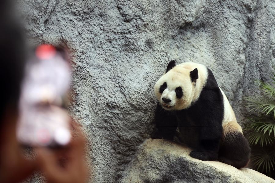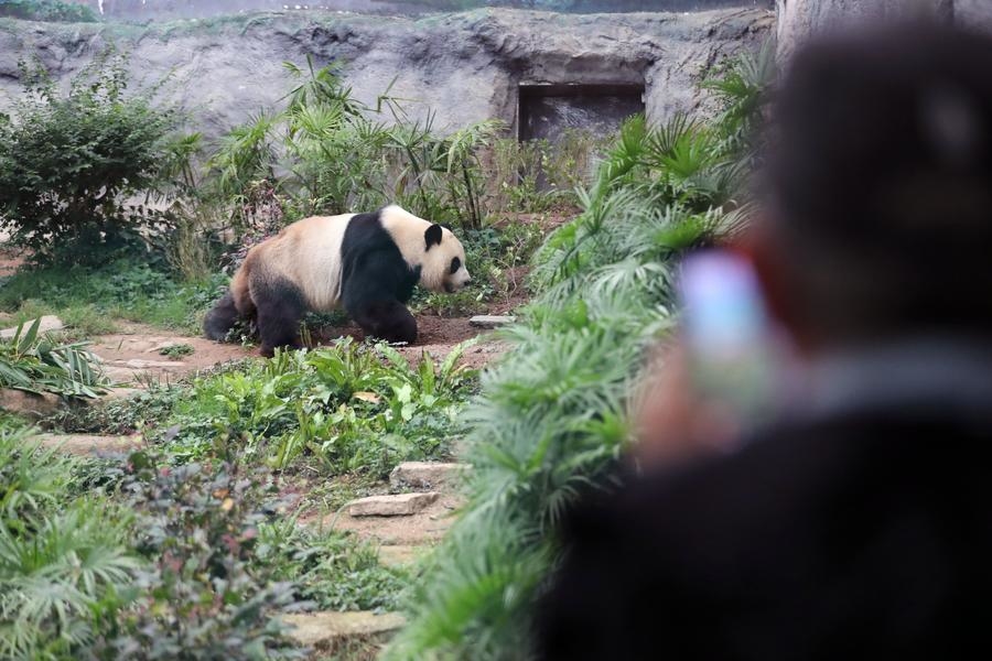 A tourist takes photos of giant panda Jianjian in Macao, south China, Nov. 20, 2024. (Xinhua/Wang Yiliang)