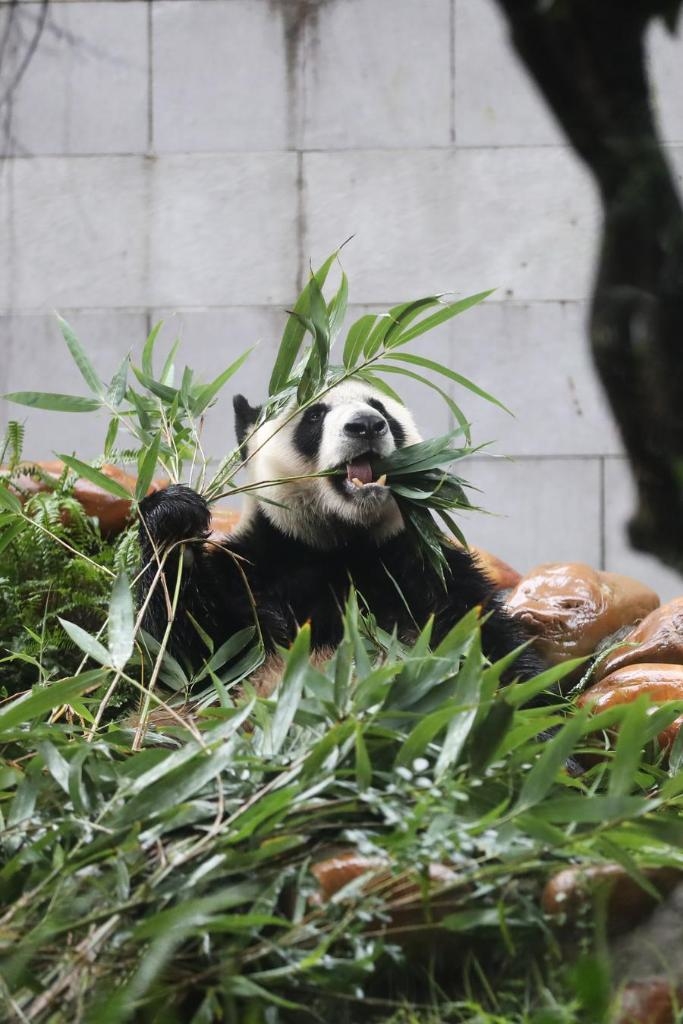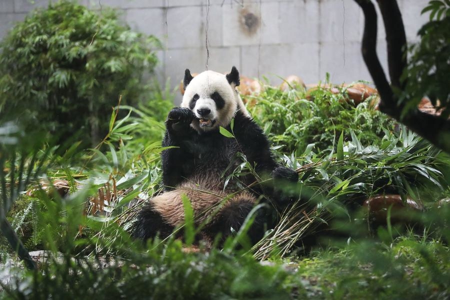 Giant panda Kaikai eats bamboo in Macao, south China, Nov. 20, 2024. (Xinhua/Wang Yiliang)