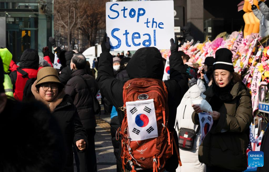 Supporters of impeached South Korean President Yoon Suk-yeol gather in a rally near the presidential residence in Seoul, South Korea, Jan. 12, 2025. South Korean President Yoon Suk-yeol will not attend the first hearing of his impeachment trial, scheduled for Tuesday, for safety concerns, Yoon's defense counsel said Sunday. (Photo by Jun Hyosang/Xinhua)