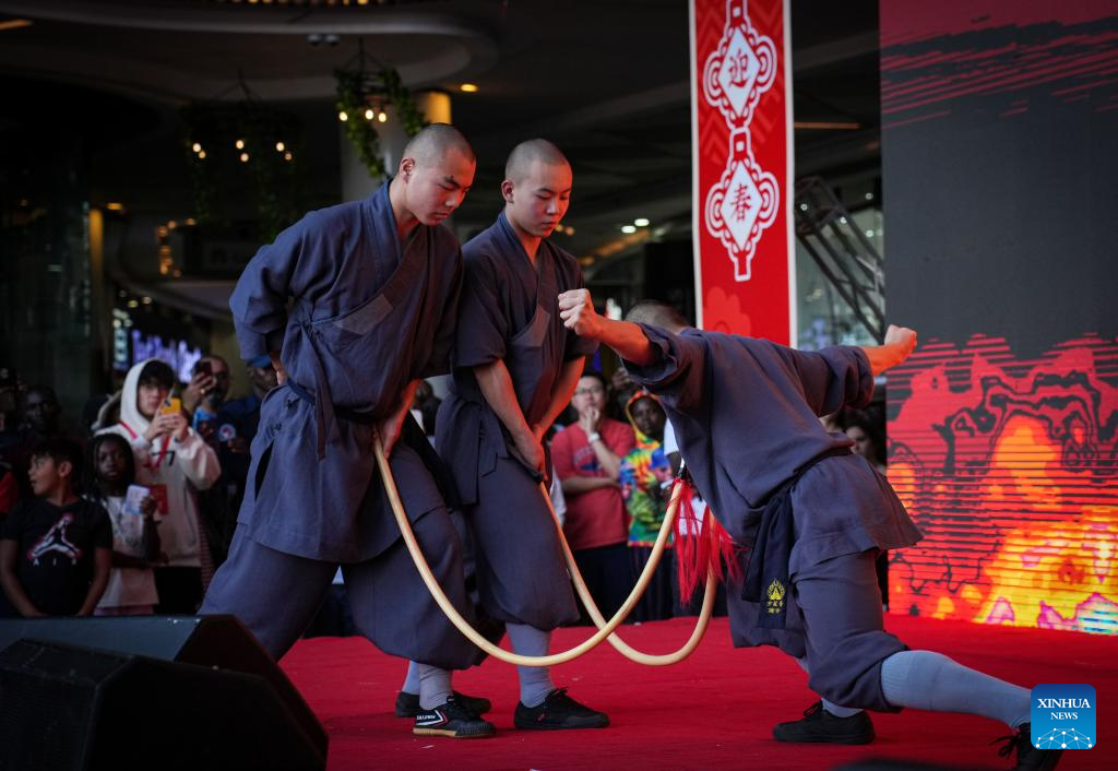 Kungfu performers from Shaolin Temple perform Qigong at a Chinese New Year gala held in Nairobi, Kenya, Jan. 19, 2025. (Xinhua/Li Yahui)