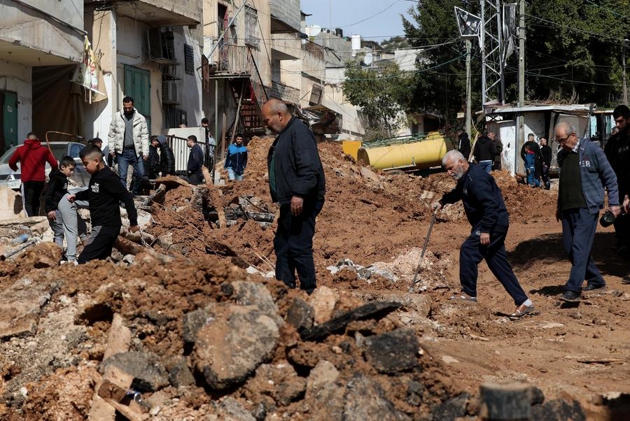 Palestinian people cross a street destroyed in an Israeli military operation at Al-Fara'a refugee camp in the West Bank city of Tubas, on Feb. 14, 2025. (Photo by Ayman Nobani/Xinhua)