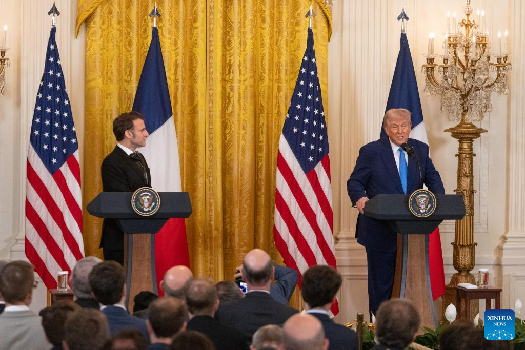 U.S. President Donald Trump (R) and French President Emmanuel Macron attend a joint press conference at the White House in Washington, D.C., the United States, on Feb. 24, 2025. U.S. President Donald Trump said on Monday that tariffs on Mexico and Canada will "go forward." When asked about an upcoming deadline for tariffs on Mexico and Canada, Trump told reporters at the joint press conference with French President Emmanuel Macron at the White House that "the tariffs are going forward." (Xinhua/Hu Yousong)