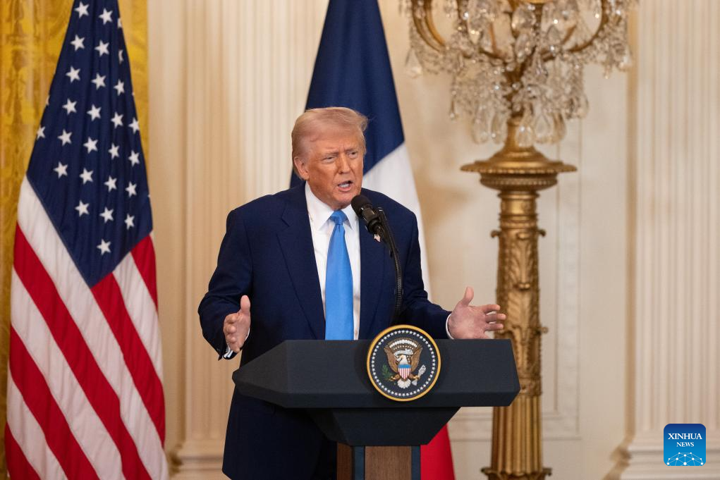 U.S. President Donald Trump speaks at a joint press conference with French President Emmanuel Macron (not in the picture) at the White House in Washington, D.C., the United States, on Feb. 24, 2025. U.S. President Donald Trump said on Monday that tariffs on Mexico and Canada will "go forward." When asked about an upcoming deadline for tariffs on Mexico and Canada, Trump told reporters at the joint press conference with French President Emmanuel Macron at the White House that "the tariffs are going forward." (Xinhua/Hu Yousong)