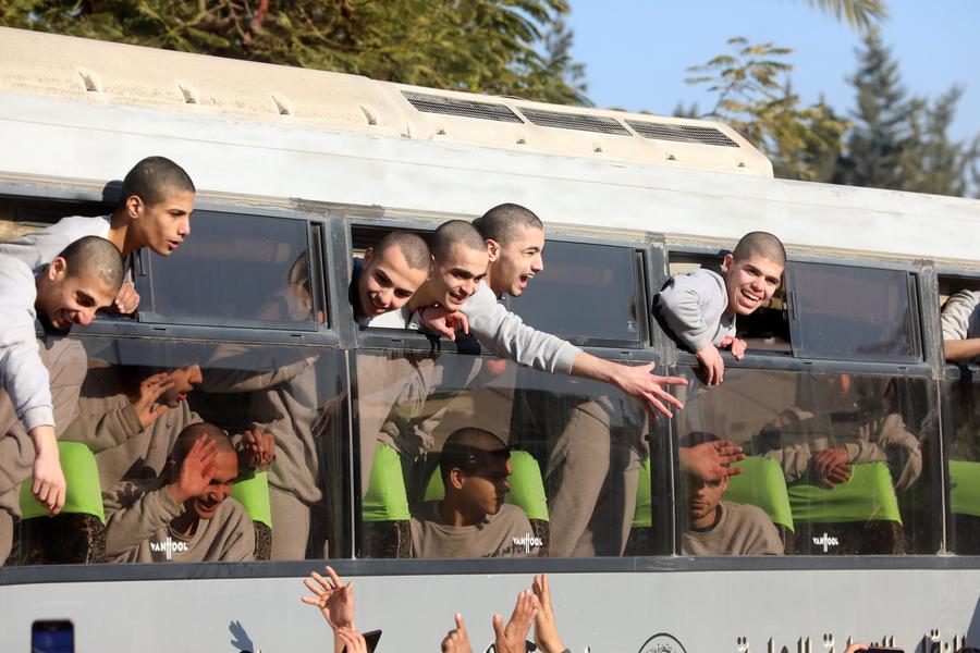 Released Palestinian prisoners are seen on a bus in the southern Gaza Strip city of Khan Younis, on Feb. 27, 2025. (Photo by Rizek Abdeljawad/Xinhua)