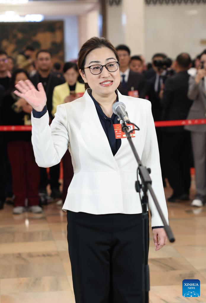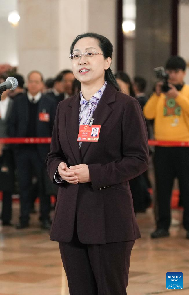 Pei Hongxia, a deputy to the 14th National People's Congress (NPC), attends a group interview ahead of the second plenary meeting of the third session of the 14th NPC at the Great Hall of the People in Beijing, capital of China, March 8, 2025. (Xinhua/Zheng Huansong)