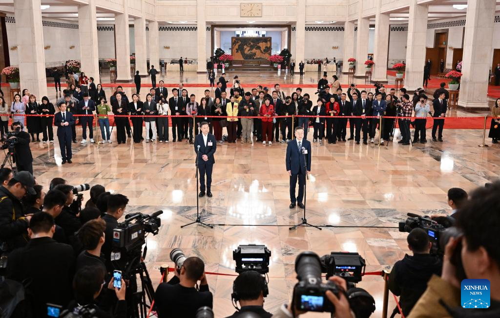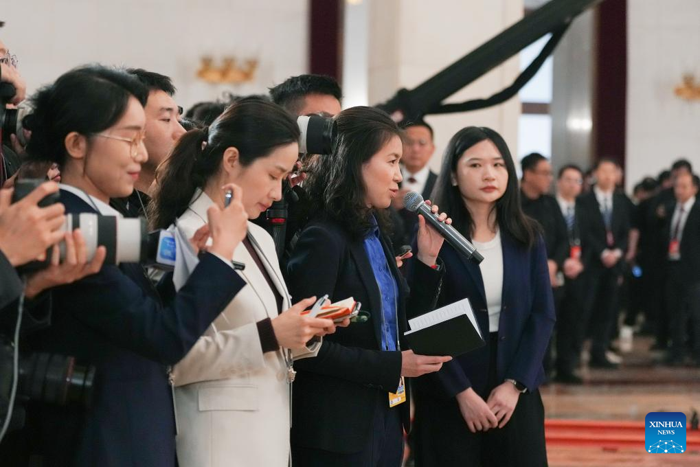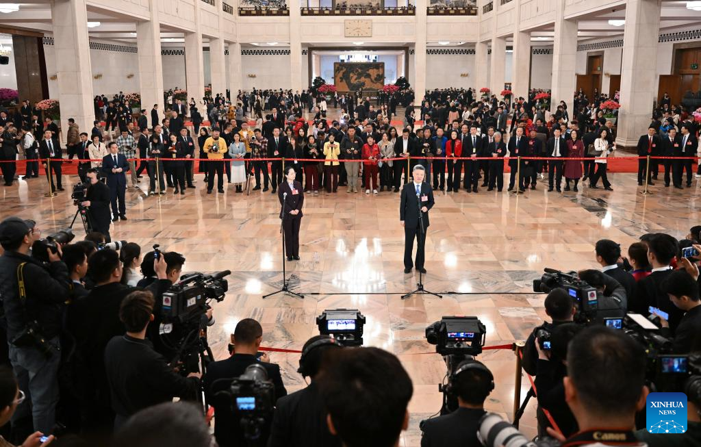 Deputies to the 14th National People's Congress (NPC) attend a group interview ahead of the second plenary meeting of the third session of the 14th NPC at the Great Hall of the People in Beijing, capital of China, March 8, 2025. (Xinhua/Lyu Shuai)
