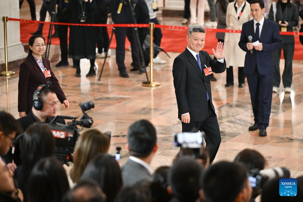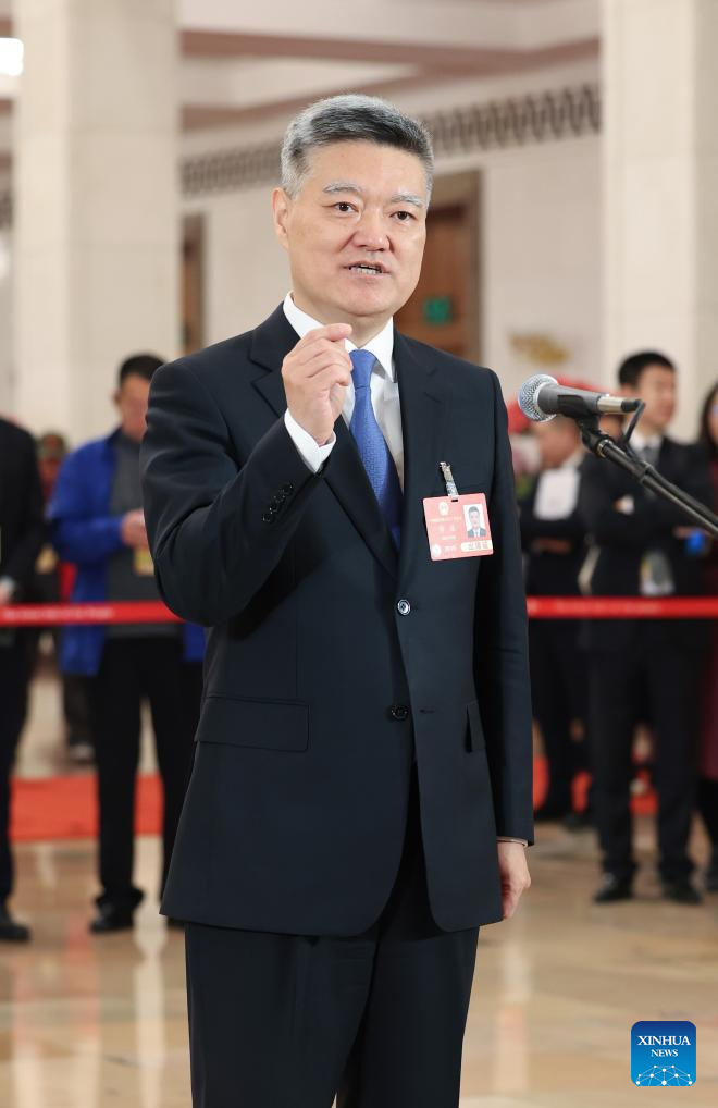 Cai Qiang, a deputy to the 14th National People's Congress (NPC), attends a group interview ahead of the second plenary meeting of the third session of the 14th NPC at the Great Hall of the People in Beijing, capital of China, March 8, 2025. (Xinhua/Lyu Shuai)