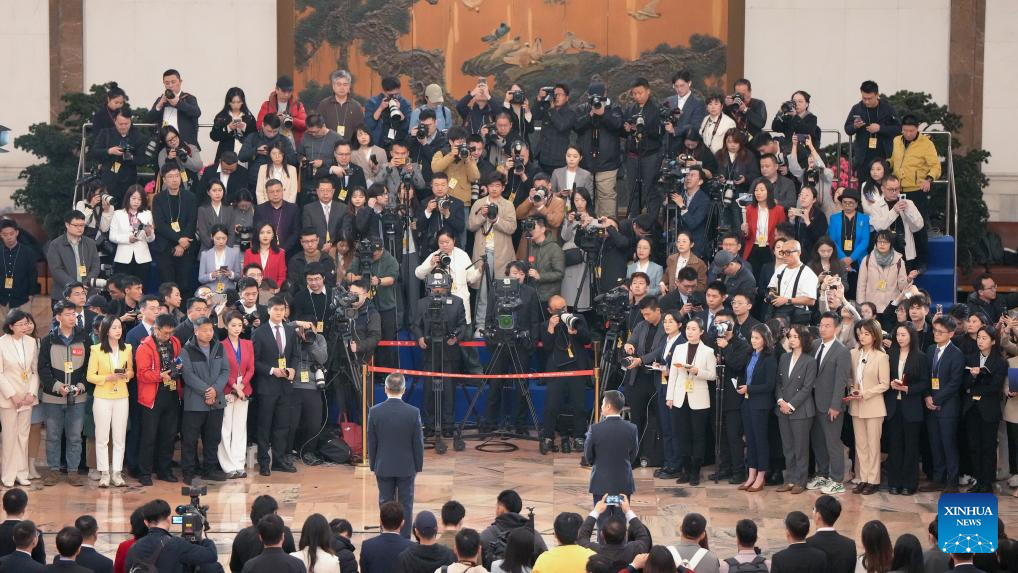 Deputies to the 14th National People's Congress (NPC) attend a group interview ahead of the second plenary meeting of the third session of the 14th NPC at the Great Hall of the People in Beijing, capital of China, March 8, 2025. (Xinhua/Zheng Huansong)