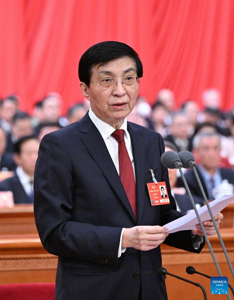 Wang Huning, chairman of the Chinese People's Political Consultative Conference (CPPCC) National Committee, presides over the closing meeting of the third session of the 14th CPPCC National Committee at the Great Hall of the People in Beijing, capital of China, March 10, 2025. Wang delivered a speech at the meeting. (Xinhua/Li Xueren)