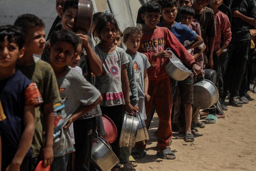 Palestinians wait to receive free food at a food distribution center in the al-Shati refugee camp, west of Gaza City, on May 28, 2025. (Photo by Rizek Abdeljawad/Xinhua)