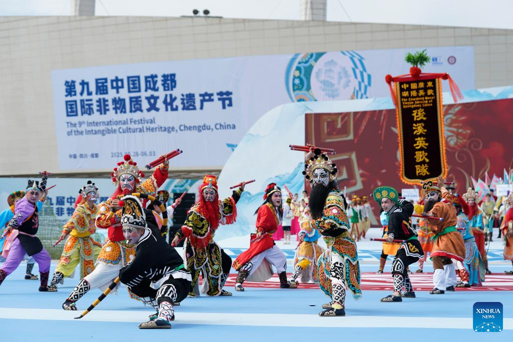 Artists perform during the 9th International Festival of the Intangible Cultural Heritage held in Chengdu, southwest China's Sichuan Province, May 28, 2025. The festival kicked off here on Wednesday, during which over 600 items of intangible cultural heritage from more than 60 countries and regions will be displayed. (Xinhua/Xu Bingjie)