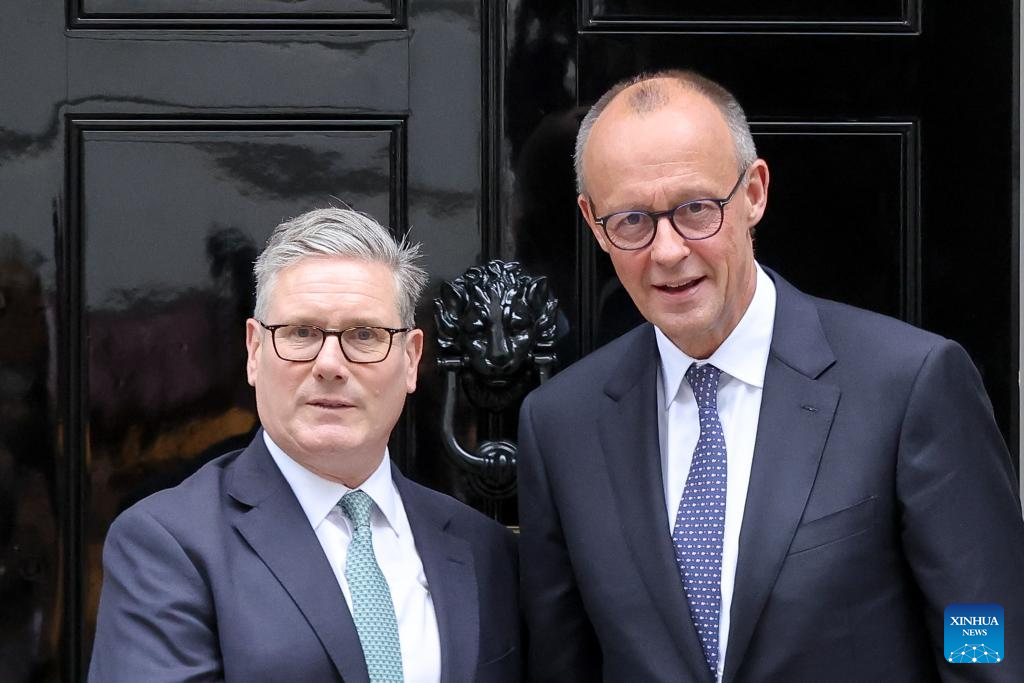 British Prime Minister Keir Starmer (L) and German Chancellor Friedrich Merz arrive at 10 Downing Street in London, Britain, on July 17, 2025. British Prime Minister Keir Starmer and German Chancellor Friedrich Merz on Thursday signed a wide-ranging bilateral deal covering various areas including defense and migration, which is believed to be the most significant treaty between Britain and Germany since the end of World War II. (Xinhua)