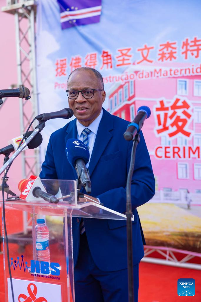 Cape Verdean Prime Minister Ulisses Correia e Silva speaks during the handover ceremony of the China-built maternity ward building of Dr. Baptista de Sousa Hospital in Mindelo, Sao Vincente Island, Cape Verde, July 22, 2025. (China Railway 14th Bureau Group Co., Ltd./Handout via Xinhua)