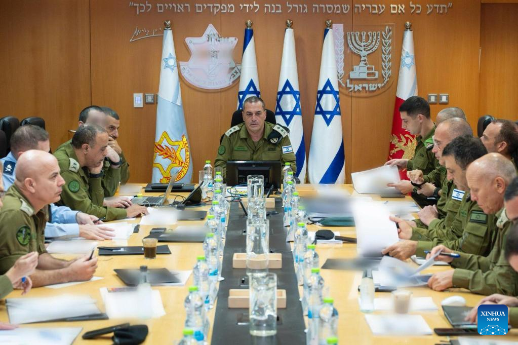 This photo released by Israel Defense Forces (IDF) on Aug. 13, 2025 shows Israel's military chief Eyal Zamir attending a meeting of security officials. (IDF/Handout via Xinhua)