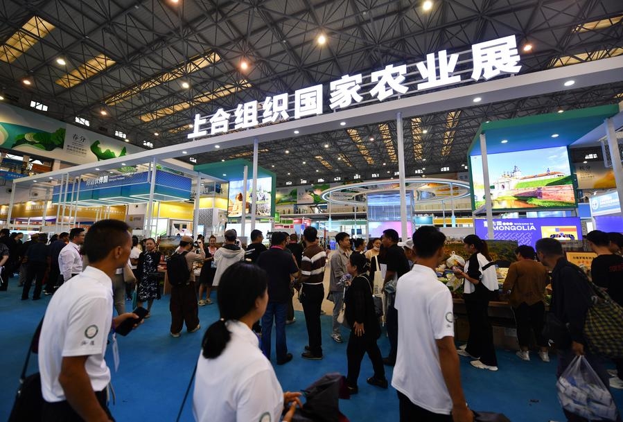 People visit an agriculture exhibition for members of the Shanghai Cooperation Organization (SCO) during the 30th China Yangling Agricultural Hi-tech Fair in Yangling, northwest China's Shaanxi Province, Sept. 19, 2023. (Xinhua/Zhang Bowen)