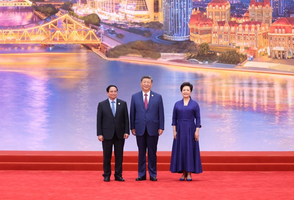 Chinese President Xi Jinping and his wife, Peng Liyuan, pose for a group photo with Vietnamese Prime Minister Pham Minh Chinh at the Meijiang Convention and Exhibition Center in Tianjin, north China, Aug. 31, 2025. Xi and Peng on Sunday hosted a banquet in China's port city of Tianjin to welcome international guests who are here to attend the Shanghai Cooperation Organization (SCO) Summit 2025. (Xinhua/Ding Haitao)