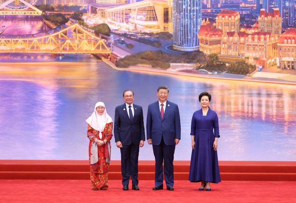 Chinese President Xi Jinping and his wife, Peng Liyuan, pose for a group photo with Malaysian Prime Minister Anwar Ibrahim and his wife at the Meijiang Convention and Exhibition Center in Tianjin, north China, Aug. 31, 2025. Xi and Peng on Sunday hosted a banquet in China's port city of Tianjin to welcome international guests who are here to attend the Shanghai Cooperation Organization (SCO) Summit 2025. (Xinhua/Ding Haitao)