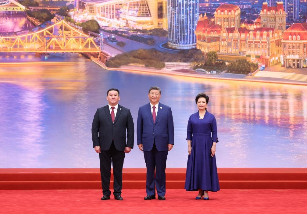 Chinese President Xi Jinping and his wife, Peng Liyuan, pose for a group photo with Mongolian President Ukhnaa Khurelsukh and his wife at the Meijiang Convention and Exhibition Center in Tianjin, north China, Aug. 31, 2025. Xi and Peng on Sunday hosted a banquet in China's port city of Tianjin to welcome international guests who are here to attend the Shanghai Cooperation Organization (SCO) Summit 2025. (Xinhua/Huang Jingwen)
