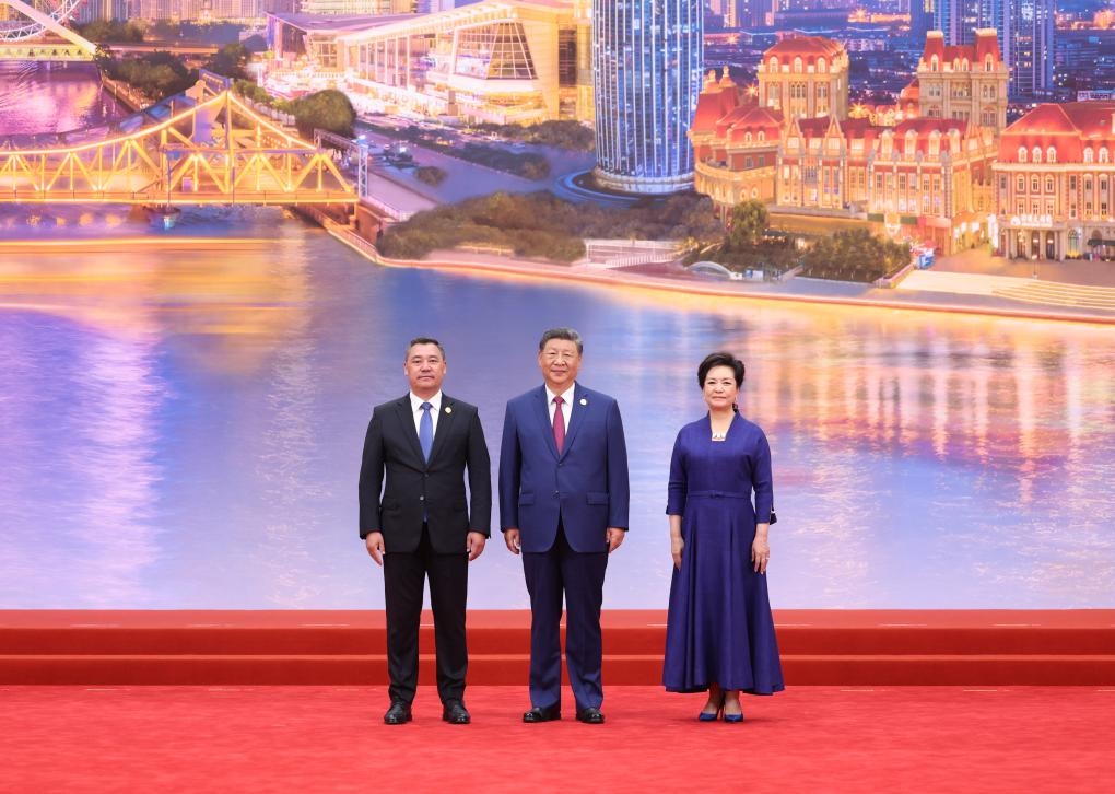 Chinese President Xi Jinping and his wife, Peng Liyuan, pose for a group photo with Kyrgyz President Sadyr Japarov at the Meijiang Convention and Exhibition Center in Tianjin, north China, Aug. 31, 2025. Xi and Peng on Sunday hosted a banquet in China's port city of Tianjin to welcome international guests who are here to attend the Shanghai Cooperation Organization (SCO) Summit 2025. (Xinhua/Huang Jingwen)