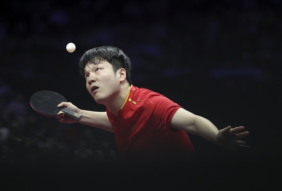 Fan Zhendong of Shanghai serves during the men's singles final against Lin Shidong of Hainan, Nov. 16, 2025. (Xinhua/Chen Bin)