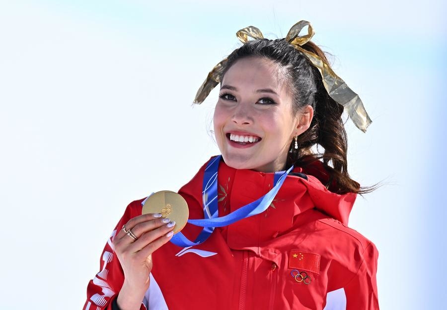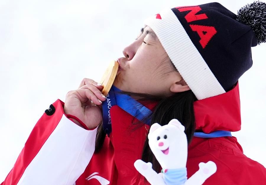 Gu Ailing of China poses during the award ceremony for women's freeski halfpipe at the Milan-Cortina 2026 Olympic Winter Games in Livigno, Italy, Feb. 22, 2026. (Xinhua/Zhang Hongxiang)