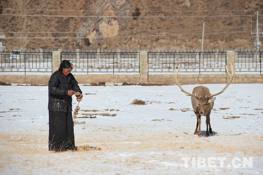 Changchub Lhamo took the feed to the red deer, calling “wooooo” to the mountains wildly. In a short while, dozens of red deer hoofed up and gathered around her, waiting to share the delicious food.