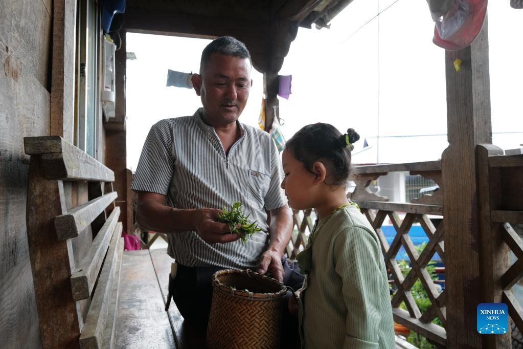 Changgar shows newly-picked tea leaves to his granddaughter in Medog County, southwest China's Tibet Autonomous Region, June 10, 2022. (Xinhua/Liu Ying)