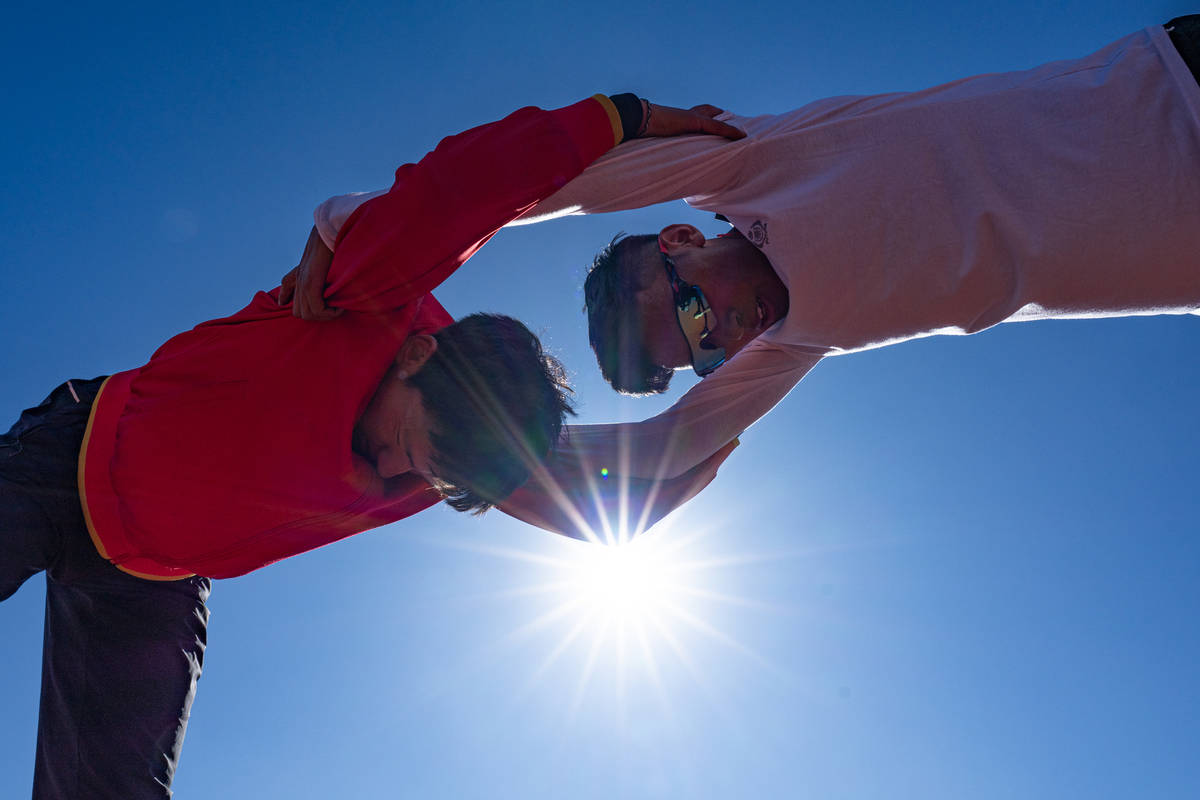 Sonam (right) stretches with a teammate. [Photo/Xinhua]