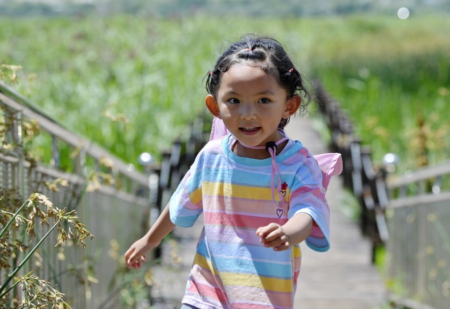 A child visits the Lhalu wetland national nature reserve in Lhasa, Southwest China's Tibet autonomous region, July 17, 2021. [Photo/Xinhua]