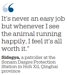"When I was patrolling the mountains around Zonag Lake at the Hoh Xil National Nature Reserve last year, I found several lost antelopes and brought them back to the station," Sidegya, 27, said as he deftly unlocked a gate in a fence and approached seven Tibetan antelopes for a closer look. "It's become a routine now to check on them every morning.