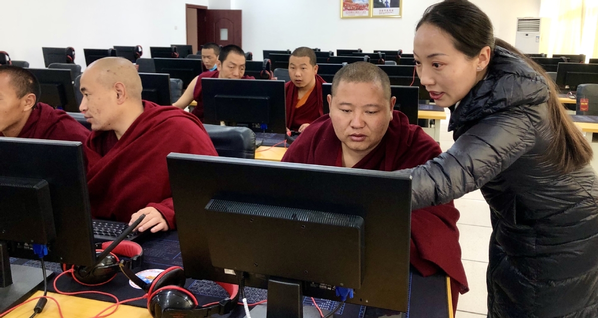 Sonam Chozin (right), a computer teacher at the Tibet College of Buddhism, takes a computer class on Friday. [Photo by Palden Nyima/chinadaily.com.cn]