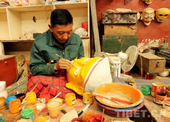 A craftsman colors a traditional Tibetan opera mask in southwest China’s Tibet Autonomous Region. (tibet.cn/Jia Huajia)