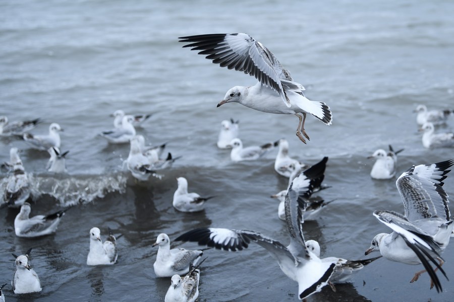 Brown-headed gulls sport on the Qinghai Lake in northwest China's Qinghai Province, Sept. 15, 2021. (Xinhua/Zhang Long)