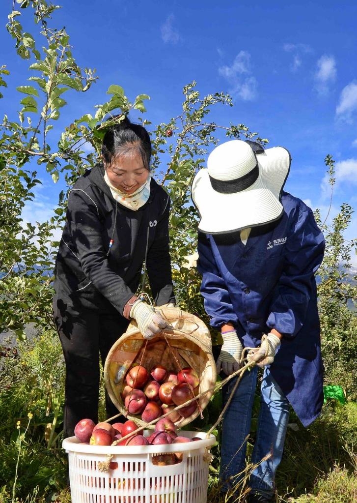 Villagers move apples in Qingde Town of Xiangcheng County, Garze Tibetan Autonomous Prefecture, southwest China's Sichuan Province, Oct. 20, 2021. (Xinhua/Liu Kun)
